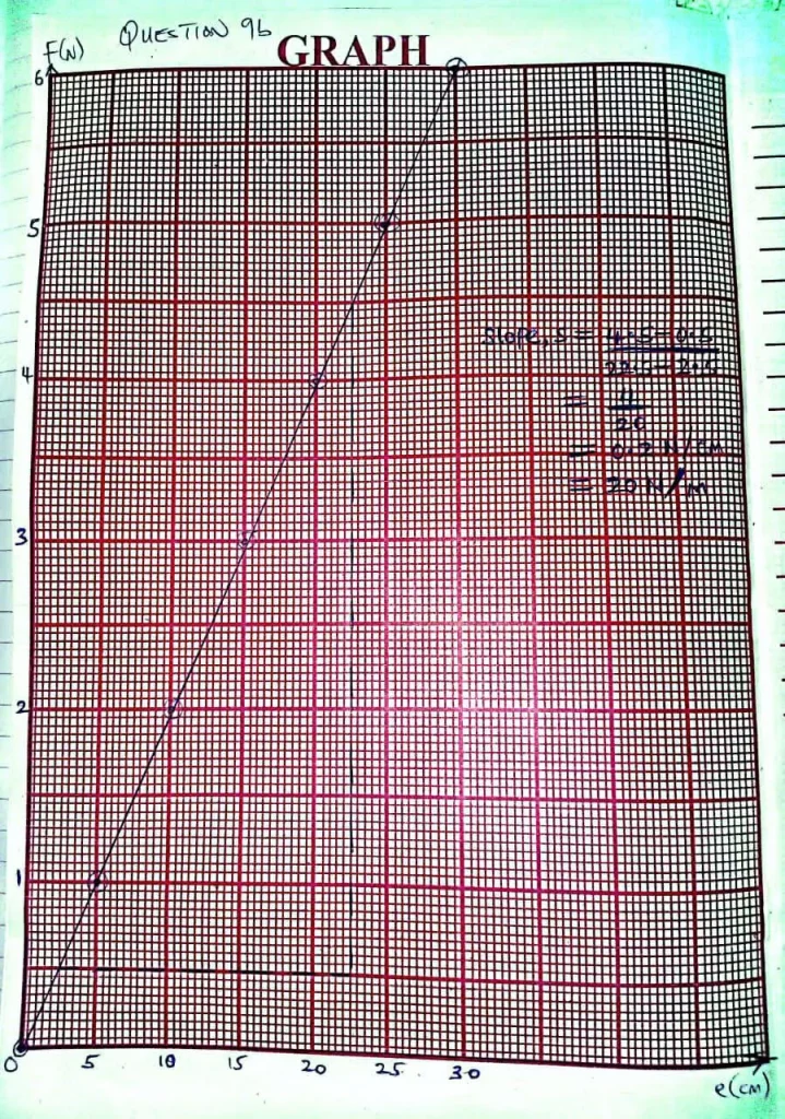 (9bii) Slope = ∆F/∆e Point 1: (Extension = 10.0 cm, Force = 2.0 N) Point 2: (Extension = 30.0 cm, Force = 6.0 N) S = (6.0-2.0)/(30.0-10.0) S = 4.0/20.0 S = 0.2N/cm